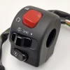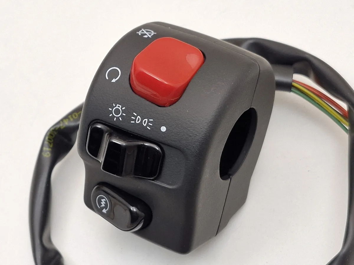 Tappokytkin, off/parkki/ajovalo kytkin sekä maaginen nappistartti. Kaasukahvan ja vaijerin paikka. 7/8″ tangolle eli 22mm tarkoitettu.